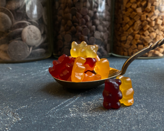 Organic fruit-flavoured gummy bears (without gelatine) These unique gummies stand out from the crowd – they are made with pure fruit concentrates, no synthetic flavours or artificial colours, no gelatine and are certified organic. The soft and chewy texture, combined with the authentic taste, makes them popular with all age groups, children and adults:-).